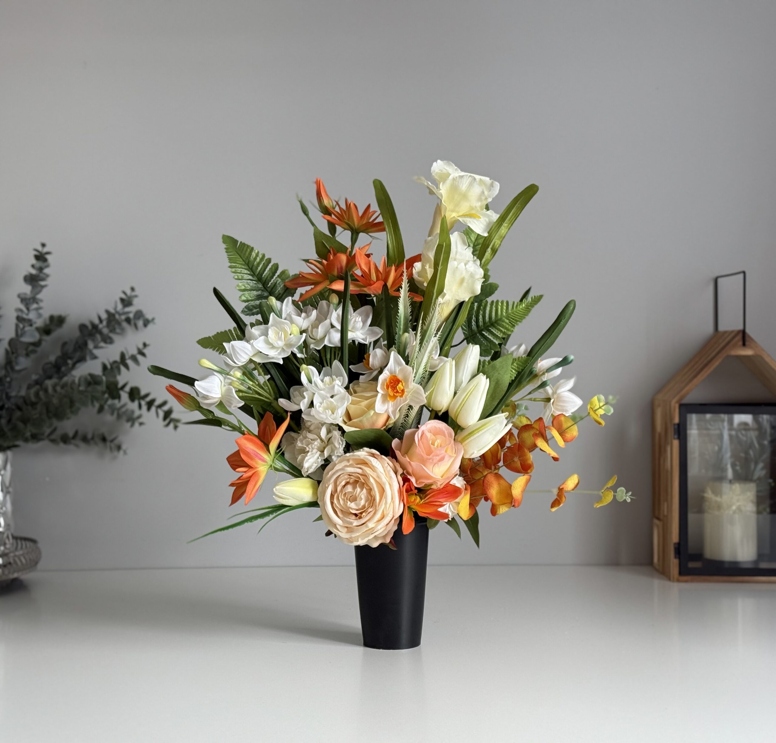 Bukiet nagrobny z kwiatów w barwach pomarańczy, kremu oraz bieli. Przygotowany w standardowym wkładzie z tworzywa sztucznego, pasującym do wazonów nagrobnych.