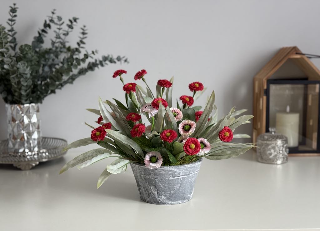 Urokliwa dekoracja kwiatowa z różowymi i czerwonymi stokrotkami w minimalistycznej donicy. Kompozycja wzbogacona liśćmi i zielenią, idealna do wprowadzenia subtelnego, naturalnego akcentu w domowym wnętrzu.