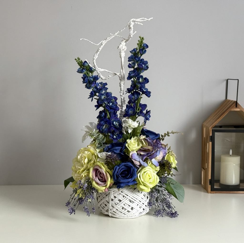 Elegancka dekoracja nagrobna w odcieniach błękitu, fioletu i kremu, umieszczona w białej plecionej podstawie. Kompozycja zawiera róże, hortensje oraz wysokie kwiaty delfinium, uzupełnione gałązkami o delikatnych białych akcentach.