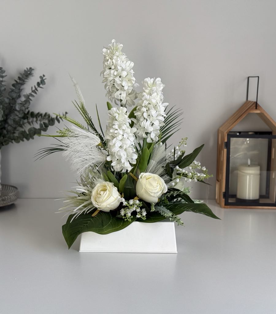 Dekoracja nagrobna z białymi hiacyntami w roli głównej, umieszczona w kwadratowej podstawie z tworzywa sztucznego. Jest to mniejsza propozycja kompozycji nagrobnej.