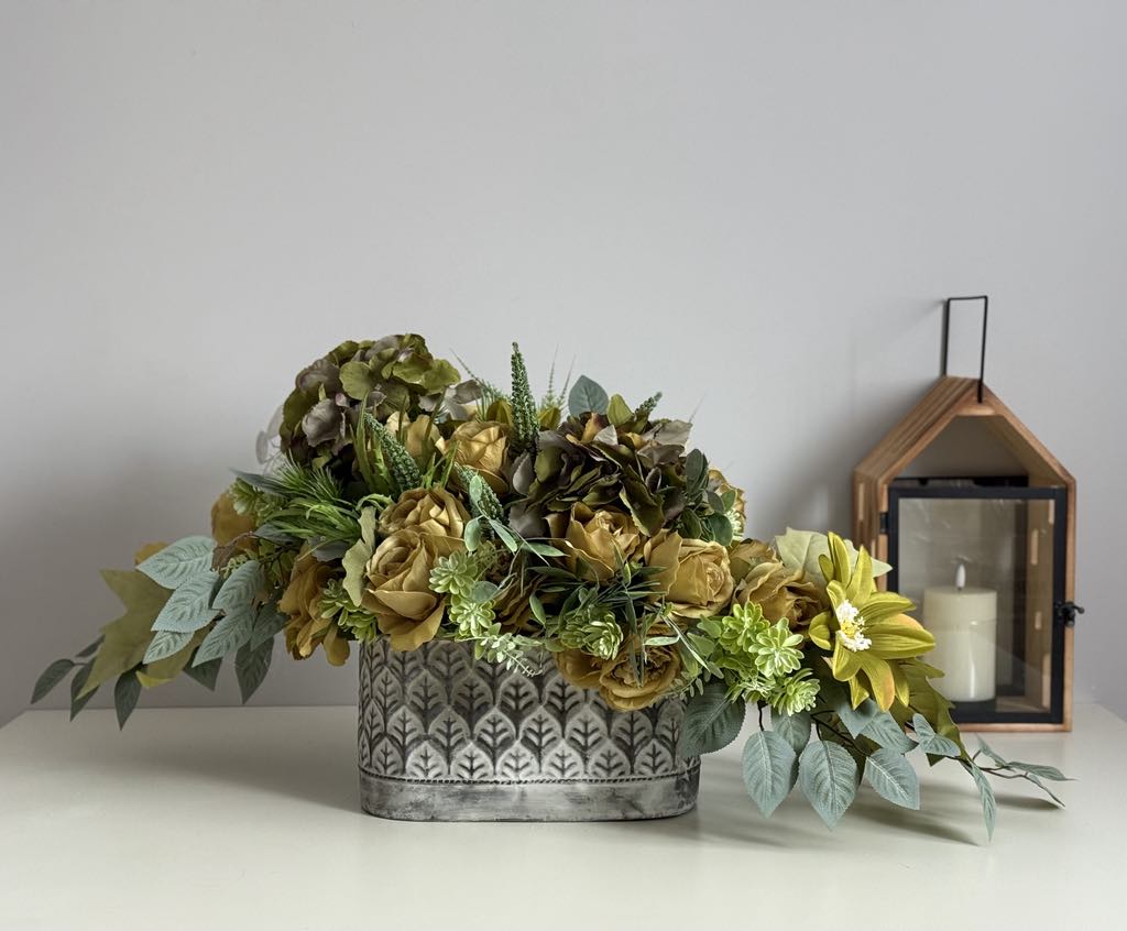Stylowa dekoracja nagrobna w oliwkowych odcieniach, umieszczona w eleganckiej metalowej donicy z delikatnym wzorem. Kompozycja składa się z róż, hortensji, liści i subtelnych zielonych akcentów.