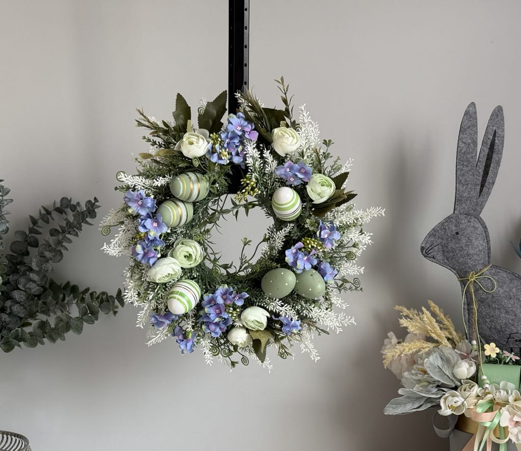 Wianek wielkanocny w pastelowych odcieniach mięty i błękitu, ozdobiony jajkami i drobnymi kwiatami. Idealny jako dekoracja na drzwi lub świąteczny stół, wprowadzająca wiosenny klimat i elegancję do Twojego domu podczas Wielkanocy.