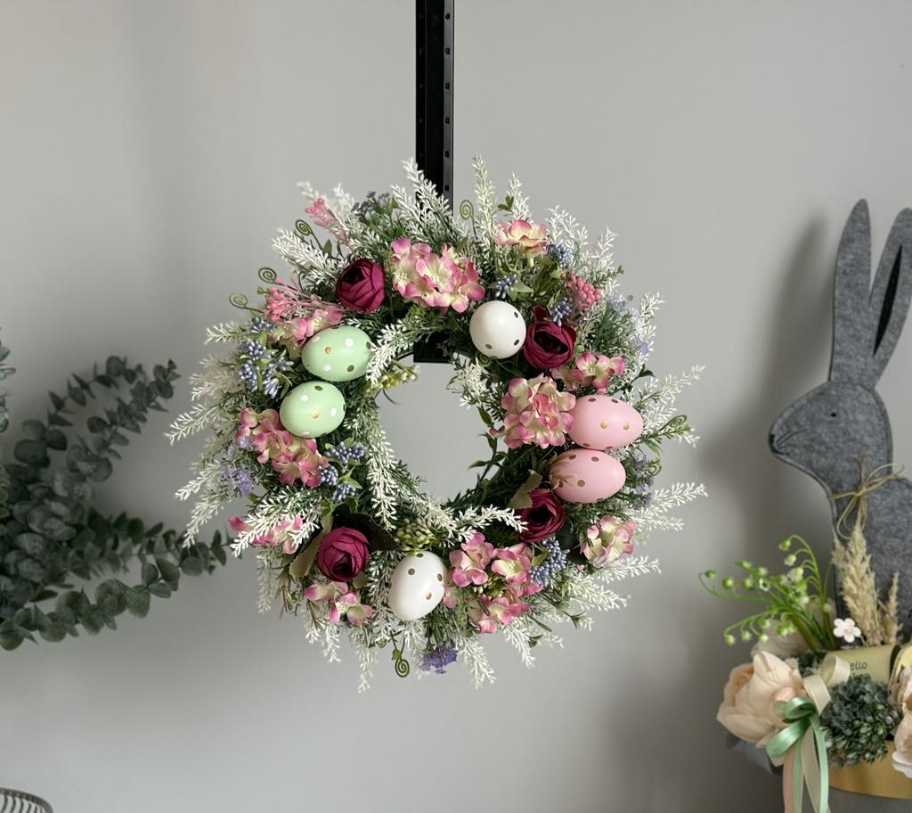 Wianek wielkanocny w pastelowych odcieniach różu, bieli i zieleni, ozdobiony jajkami, kwiatami. Idealna dekoracja na drzwi lub ścianę, która podkreśla wiosenny klimat i elegancję podczas Wielkanocy.