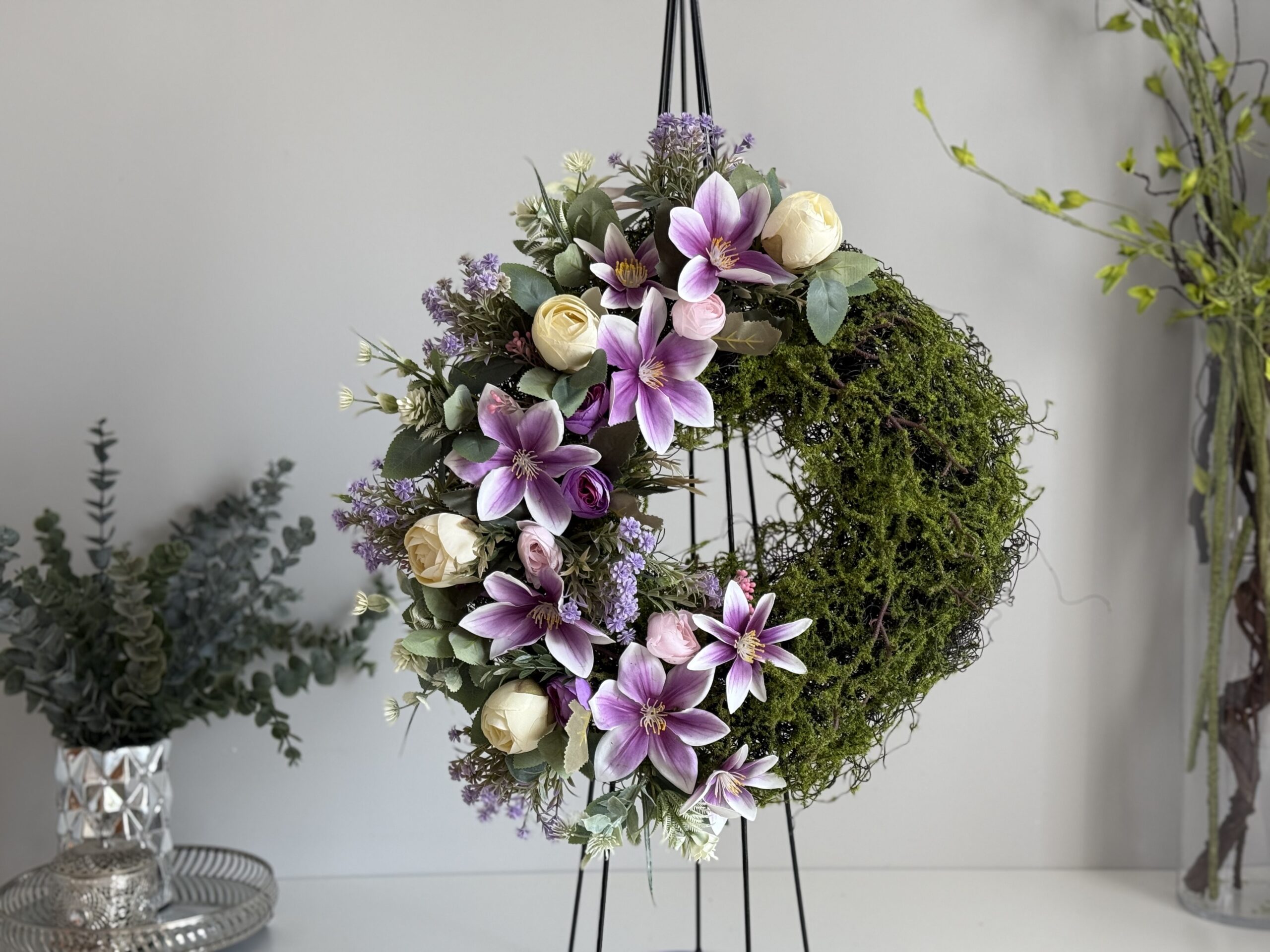 Wianek kwiatowy w odcieniach pastelowych fioletów, z wysokiej jakości materiałów. Wykonany na podkładzie z drutu powlekany sztucznym mchem, który do złudzenia przypomina naturalny. Uniwersalna dekoracja na każdą porę roku. Idealny jako ozdoba wnętrz na drzwi, ścianę lub stół.