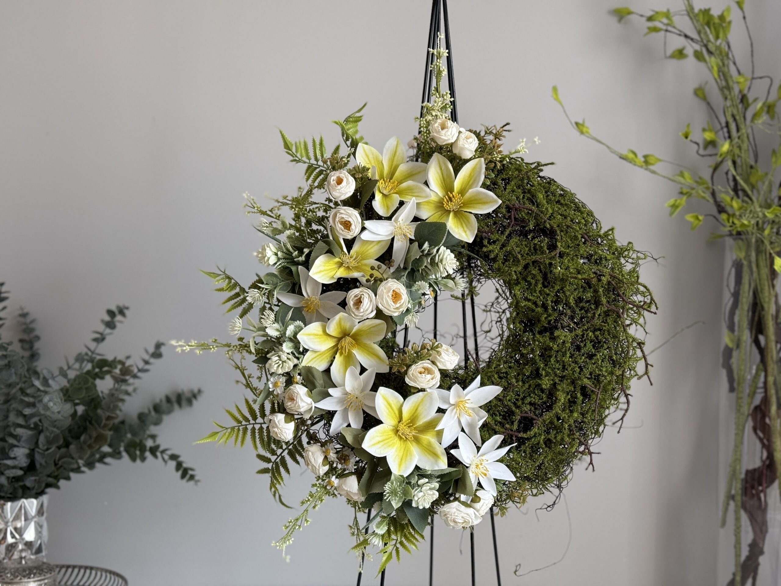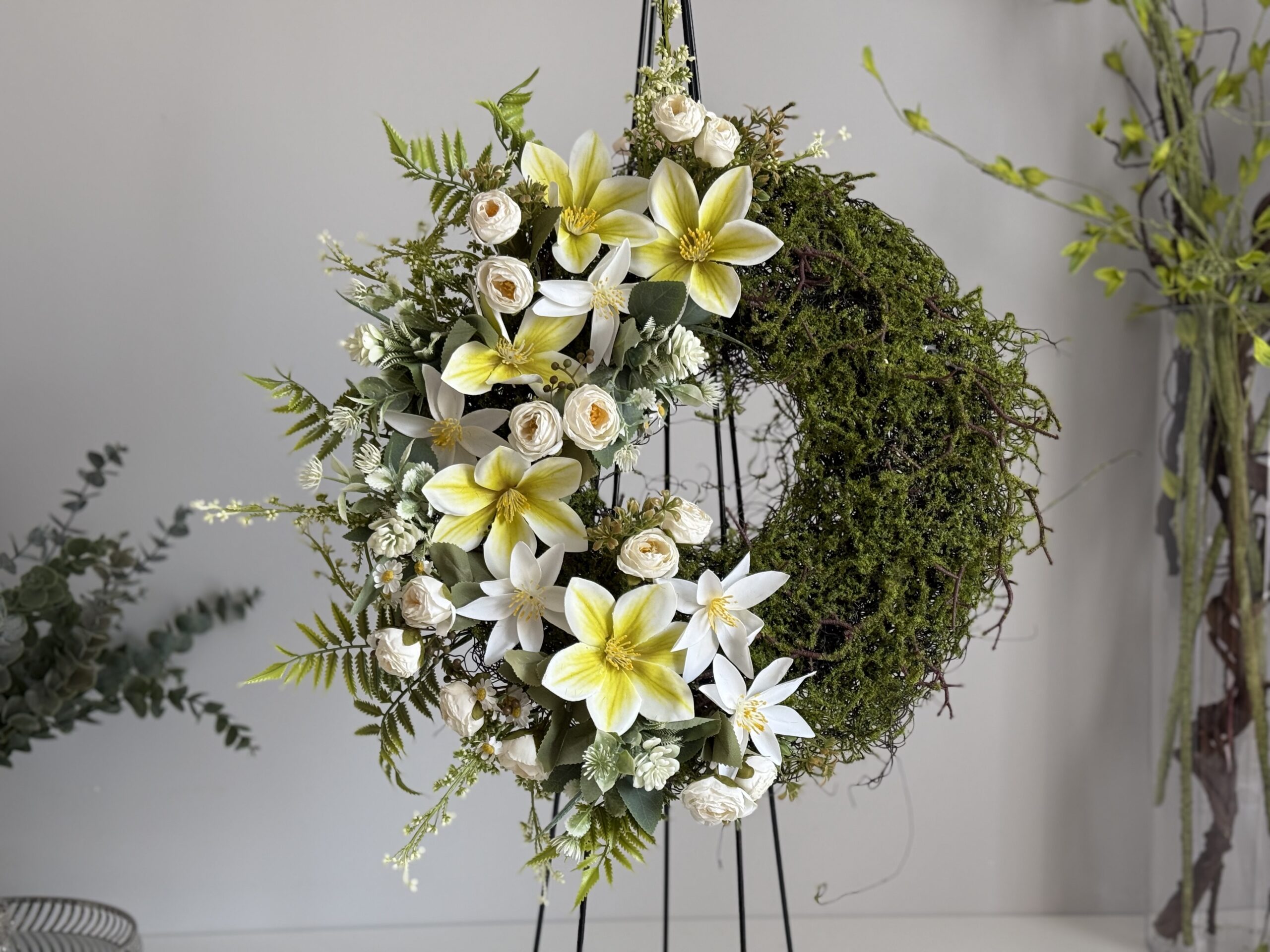 Wianek kwiatowy w stonowanych barwach bieli z akcentem limonki, z wysokiej jakości materiałów. Wykonany na podkładzie z drutu powlekany sztucznym mchem, który do złudzenia przypomina naturalny. Uniwersalna dekoracja na każdą porę rok